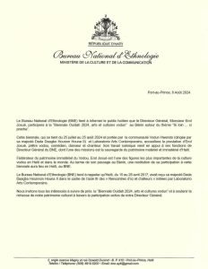 Dans une note publiée le 8 août 2024, le Bureau National d’Ethnologie annonce la participation de son directeur, le chanteur Erol Josué, à la Biennale Ouidah 2024 dédiée aux arts et cultures vodoun. Cet événement se déroule actuellement au Bénin et se poursuivra jusqu’au 25 août 2024.
